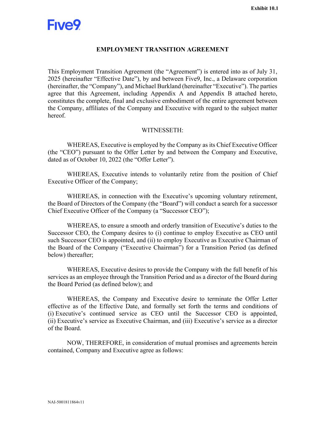 NAI-5001811864v11 EMPLOYMENT TRANSITION AGREEMENT This Employment Transition Agreement (the “Agreement”) is entered into as of July 31, 2025 (hereinafter “Effective Date”), by and between Five9, Inc., a Delaware corporation (hereinafter, the “Company”), and Michael Burkland (hereinafter “Executive”). The parties agree that this Agreement, including Appendix A and Appendix B attached hereto, constitutes the complete, final and exclusive embodiment of the entire agreement between the Company, affiliates of the Company and Executive with regard to the subject matter hereof. WITNESSETH: WHEREAS, Executive is employed by the Company as its Chief Executive Officer (the “CEO”) pursuant to the Offer Letter by and between the Company and Executive, dated as of October 10, 2022 (the “Offer Letter”). WHEREAS, Executive intends to voluntarily retire from the position of Chief Executive Officer of the Company; WHEREAS, in connection with the Executive’s upcoming voluntary retirement, the Board of Directors of the Company (the “Board”) will conduct a search for a successor Chief Executive Officer of the Company (a “Successor CEO”); WHEREAS, to ensure a smooth and orderly transition of Executive’s duties to the Successor CEO, the Company desires to (i) continue to employ Executive as CEO until such Successor CEO is appointed, and (ii) to employ Executive as Executive Chairman of the Board of the Company (“Executive Chairman”) for a Transition Period (as defined below) thereafter; WHEREAS, Executive desires to provide the Company with the full benefit of his services as an employee through the Transition Period and as a director of the Board during the Board Period (as defined below); and WHEREAS, the Company and Executive desire to terminate the Offer Letter effective as of the Effective Date, and formally set forth the terms and conditions of (i) Executive’s continued service as CEO until the Successor CEO is appointed, (ii) Executive’s service as Executive Chairman, and (iii) Executive’s service as a director of the Board. NOW, THEREFORE, in consideration of mutual promises and agreements herein contained, Company and Executive agree as follows: Exhibit 10.1