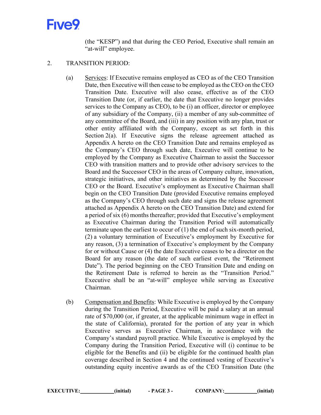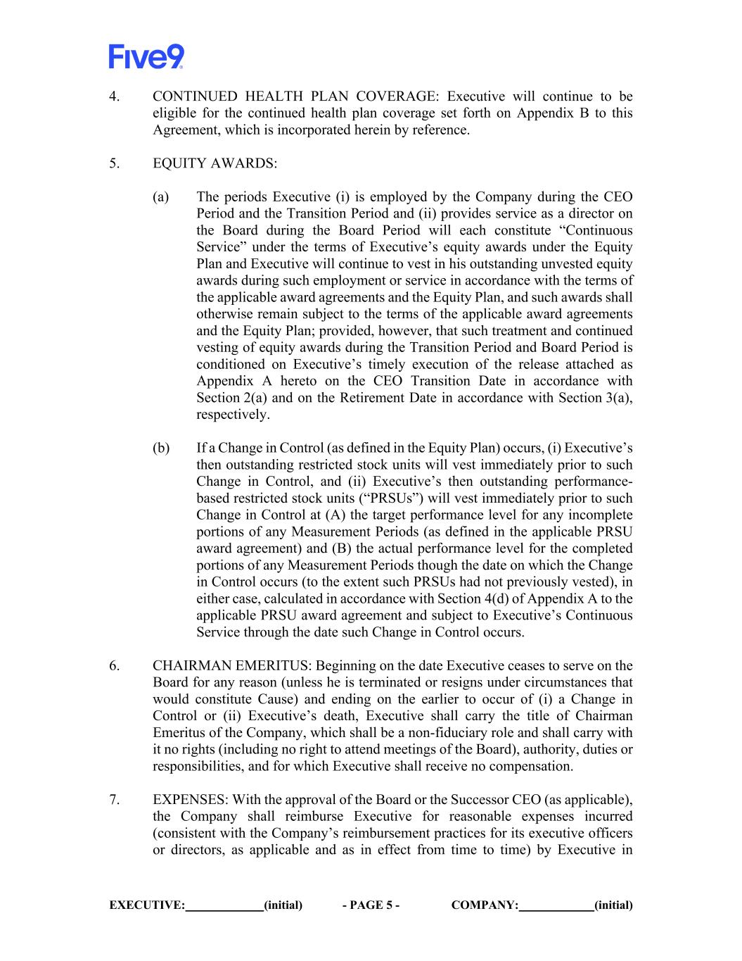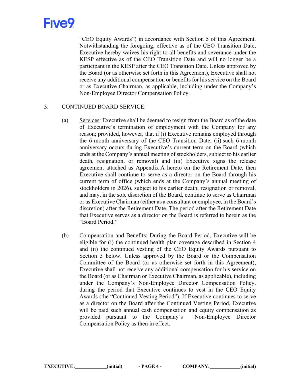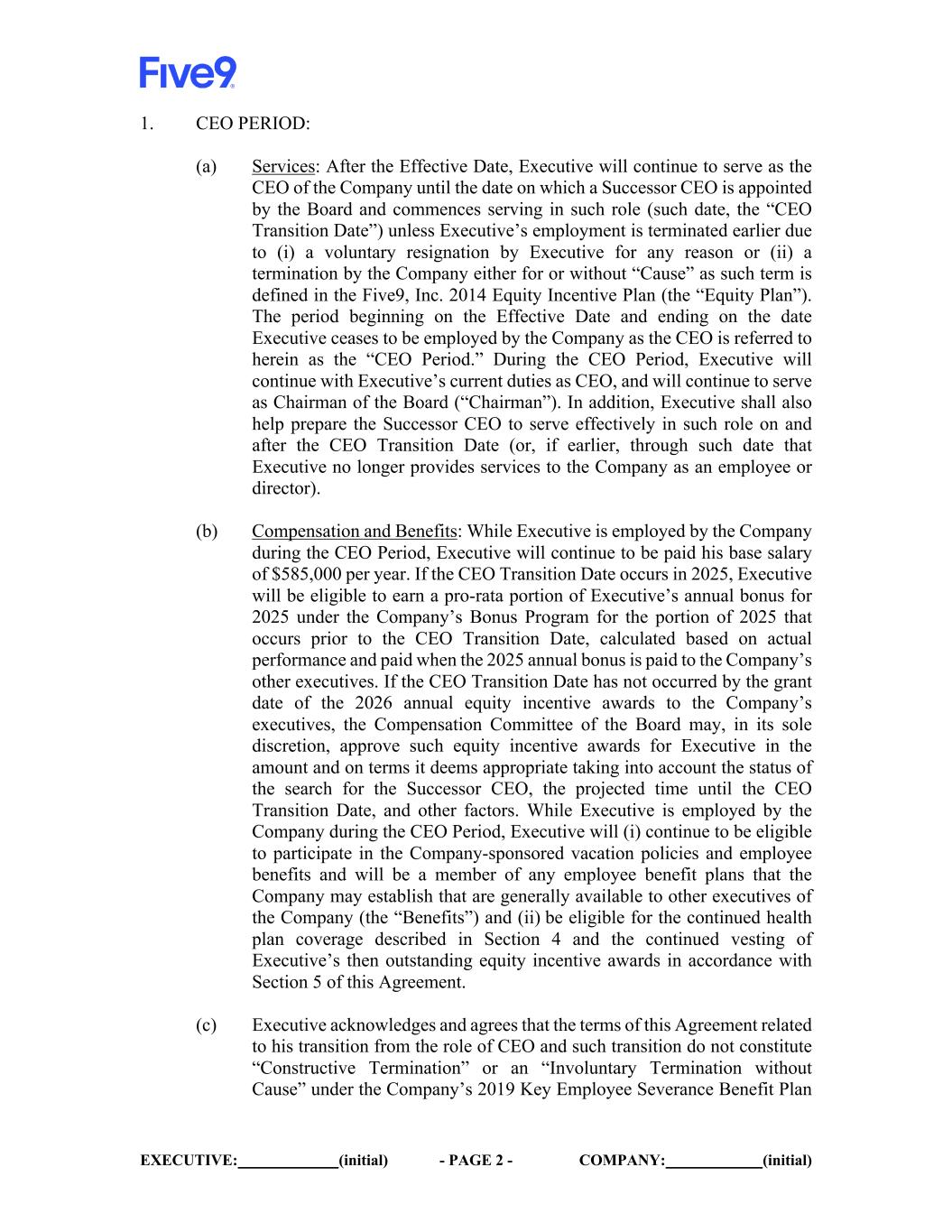EXECUTIVE: (initial) - PAGE 2 - COMPANY: (initial) 1. CEO PERIOD: (a) Services: After the Effective Date, Executive will continue to serve as the CEO of the Company until the date on which a Successor CEO is appointed by the Board and commences serving in such role (such date, the “CEO Transition Date”) unless Executive’s employment is terminated earlier due to (i) a voluntary resignation by Executive for any reason or (ii) a termination by the Company either for or without “Cause” as such term is defined in the Five9, Inc. 2014 Equity Incentive Plan (the “Equity Plan”). The period beginning on the Effective Date and ending on the date Executive ceases to be employed by the Company as the CEO is referred to herein as the “CEO Period.” During the CEO Period, Executive will continue with Executive’s current duties as CEO, and will continue to serve as Chairman of the Board (“Chairman”). In addition, Executive shall also help prepare the Successor CEO to serve effectively in such role on and after the CEO Transition Date (or, if earlier, through such date that Executive no longer provides services to the Company as an employee or director). (b) Compensation and Benefits: While Executive is employed by the Company during the CEO Period, Executive will continue to be paid his base salary of $585,000 per year. If the CEO Transition Date occurs in 2025, Executive will be eligible to earn a pro-rata portion of Executive’s annual bonus for 2025 under the Company’s Bonus Program for the portion of 2025 that occurs prior to the CEO Transition Date, calculated based on actual performance and paid when the 2025 annual bonus is paid to the Company’s other executives. If the CEO Transition Date has not occurred by the grant date of the 2026 annual equity incentive awards to the Company’s executives, the Compensation Committee of the Board may, in its sole discretion, approve such equity incentive awards for Executive in the amount and on terms it deems appropriate taking into account the status of the search for the Successor CEO, the projected time until the CEO Transition Date, and other factors. While Executive is employed by the Company during the CEO Period, Executive will (i) continue to be eligible to participate in the Company-sponsored vacation policies and employee benefits and will be a member of any employee benefit plans that the Company may establish that are generally available to other executives of the Company (the “Benefits”) and (ii) be eligible for the continued health plan coverage described in Section 4 and the continued vesting of Executive’s then outstanding equity incentive awards in accordance with Section 5 of this Agreement. (c) Executive acknowledges and agrees that the terms of this Agreement related to his transition from the role of CEO and such transition do not constitute “Constructive Termination” or an “Involuntary Termination without Cause” under the Company’s 2019 Key Employee Severance Benefit Plan