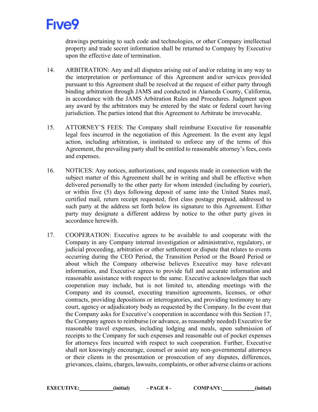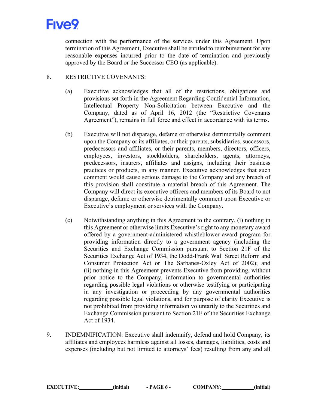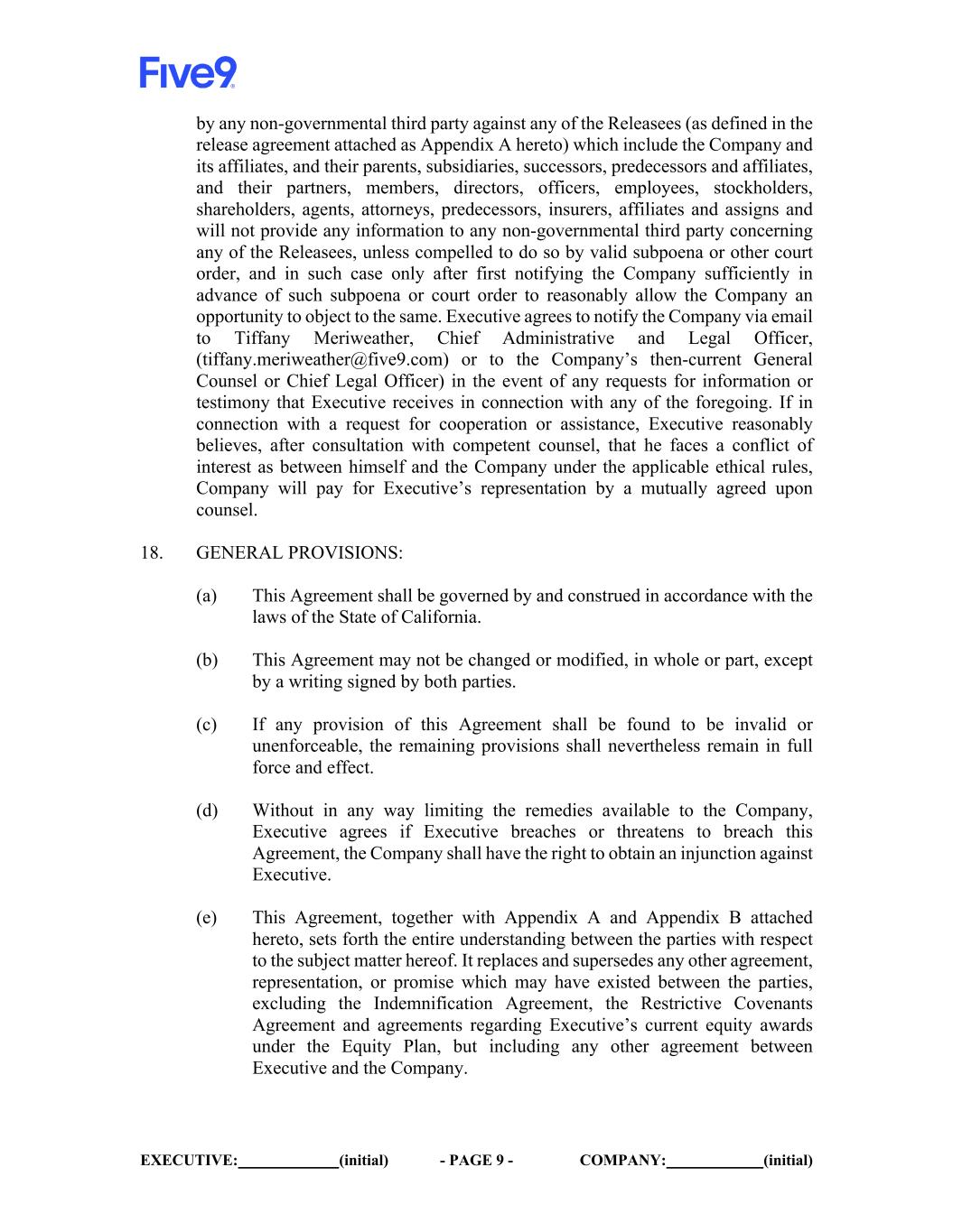 EXECUTIVE: (initial) - PAGE 9 - COMPANY: (initial) by any non-governmental third party against any of the Releasees (as defined in the release agreement attached as Appendix A hereto) which include the Company and its affiliates, and their parents, subsidiaries, successors, predecessors and affiliates, and their partners, members, directors, officers, employees, stockholders, shareholders, agents, attorneys, predecessors, insurers, affiliates and assigns and will not provide any information to any non-governmental third party concerning any of the Releasees, unless compelled to do so by valid subpoena or other court order, and in such case only after first notifying the Company sufficiently in advance of such subpoena or court order to reasonably allow the Company an opportunity to object to the same. Executive agrees to notify the Company via email to Tiffany Meriweather, Chief Administrative and Legal Officer, (tiffany.meriweather@five9.com) or to the Company’s then-current General Counsel or Chief Legal Officer) in the event of any requests for information or testimony that Executive receives in connection with any of the foregoing. If in connection with a request for cooperation or assistance, Executive reasonably believes, after consultation with competent counsel, that he faces a conflict of interest as between himself and the Company under the applicable ethical rules, Company will pay for Executive’s representation by a mutually agreed upon counsel. 18. GENERAL PROVISIONS: (a) This Agreement shall be governed by and construed in accordance with the laws of the State of California. (b) This Agreement may not be changed or modified, in whole or part, except by a writing signed by both parties. (c) If any provision of this Agreement shall be found to be invalid or unenforceable, the remaining provisions shall nevertheless remain in full force and effect. (d) Without in any way limiting the remedies available to the Company, Executive agrees if Executive breaches or threatens to breach this Agreement, the Company shall have the right to obtain an injunction against Executive. (e) This Agreement, together with Appendix A and Appendix B attached hereto, sets forth the entire understanding between the parties with respect to the subject matter hereof. It replaces and supersedes any other agreement, representation, or promise which may have existed between the parties, excluding the Indemnification Agreement, the Restrictive Covenants Agreement and agreements regarding Executive’s current equity awards under the Equity Plan, but including any other agreement between Executive and the Company.
