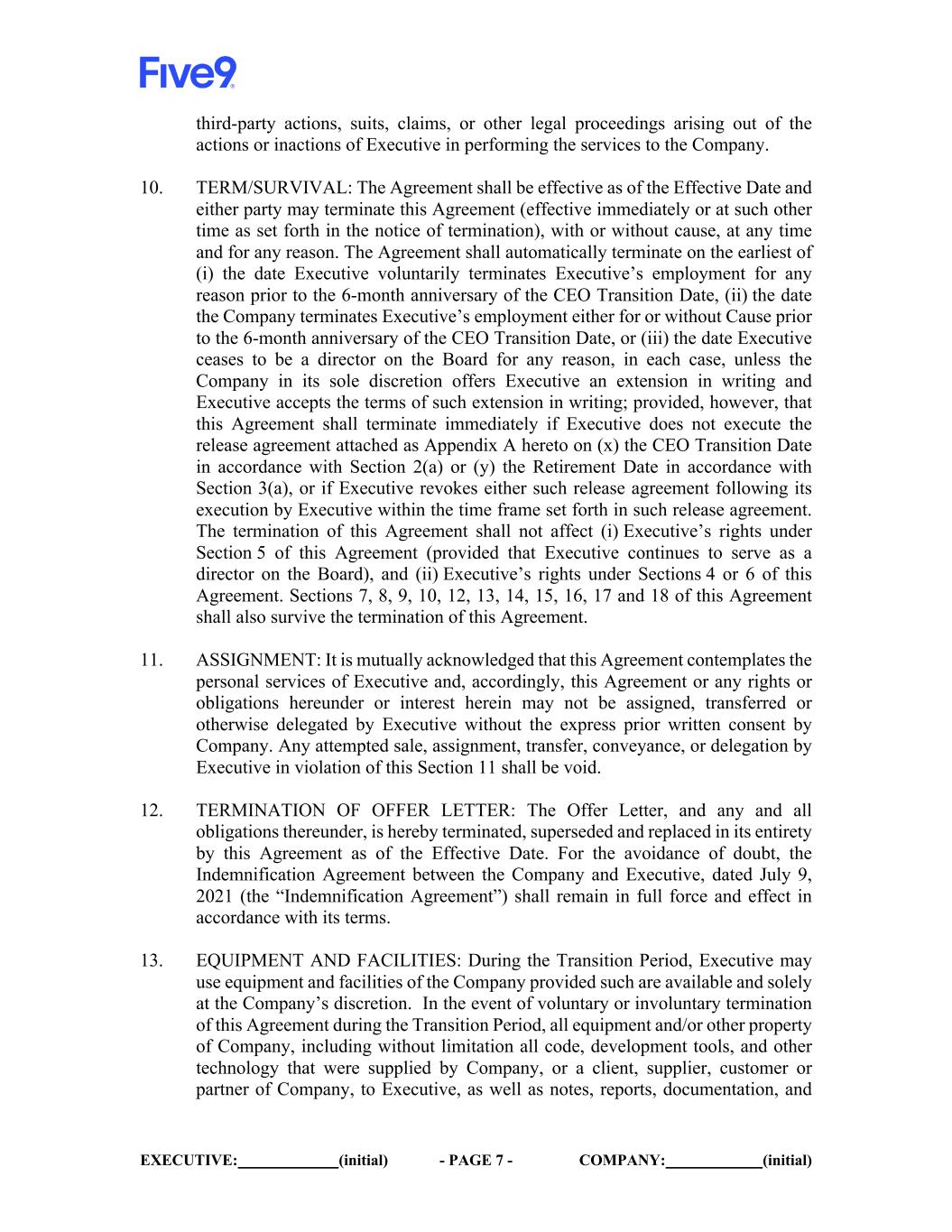 EXECUTIVE: (initial) - PAGE 7 - COMPANY: (initial) third-party actions, suits, claims, or other legal proceedings arising out of the actions or inactions of Executive in performing the services to the Company. 10. TERM/SURVIVAL: The Agreement shall be effective as of the Effective Date and either party may terminate this Agreement (effective immediately or at such other time as set forth in the notice of termination), with or without cause, at any time and for any reason. The Agreement shall automatically terminate on the earliest of (i) the date Executive voluntarily terminates Executive’s employment for any reason prior to the 6-month anniversary of the CEO Transition Date, (ii) the date the Company terminates Executive’s employment either for or without Cause prior to the 6-month anniversary of the CEO Transition Date, or (iii) the date Executive ceases to be a director on the Board for any reason, in each case, unless the Company in its sole discretion offers Executive an extension in writing and Executive accepts the terms of such extension in writing; provided, however, that this Agreement shall terminate immediately if Executive does not execute the release agreement attached as Appendix A hereto on (x) the CEO Transition Date in accordance with Section 2(a) or (y) the Retirement Date in accordance with Section 3(a), or if Executive revokes either such release agreement following its execution by Executive within the time frame set forth in such release agreement. The termination of this Agreement shall not affect (i) Executive’s rights under Section 5 of this Agreement (provided that Executive continues to serve as a director on the Board), and (ii) Executive’s rights under Sections 4 or 6 of this Agreement. Sections 7, 8, 9, 10, 12, 13, 14, 15, 16, 17 and 18 of this Agreement shall also survive the termination of this Agreement. 11. ASSIGNMENT: It is mutually acknowledged that this Agreement contemplates the personal services of Executive and, accordingly, this Agreement or any rights or obligations hereunder or interest herein may not be assigned, transferred or otherwise delegated by Executive without the express prior written consent by Company. Any attempted sale, assignment, transfer, conveyance, or delegation by Executive in violation of this Section 11 shall be void. 12. TERMINATION OF OFFER LETTER: The Offer Letter, and any and all obligations thereunder, is hereby terminated, superseded and replaced in its entirety by this Agreement as of the Effective Date. For the avoidance of doubt, the Indemnification Agreement between the Company and Executive, dated July 9, 2021 (the “Indemnification Agreement”) shall remain in full force and effect in accordance with its terms. 13. EQUIPMENT AND FACILITIES: During the Transition Period, Executive may use equipment and facilities of the Company provided such are available and solely at the Company’s discretion. In the event of voluntary or involuntary termination of this Agreement during the Transition Period, all equipment and/or other property of Company, including without limitation all code, development tools, and other technology that were supplied by Company, or a client, supplier, customer or partner of Company, to Executive, as well as notes, reports, documentation, and