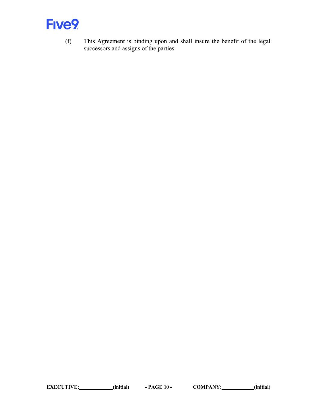 EXECUTIVE: (initial) - PAGE 10 - COMPANY: (initial) (f) This Agreement is binding upon and shall insure the benefit of the legal successors and assigns of the parties.