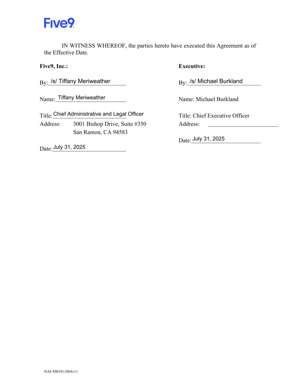 NAI-5001811864v11 IN WITNESS WHEREOF, the parties hereto have executed this Agreement as of the Effective Date. Five9, Inc.: Executive: By: By: Name: Name: Michael Burkland Title: Title: Chief Executive Officer Address: 3001 Bishop Drive, Suite #350 San Ramon, CA 94583 Address: Date: Date: Chief Administrative and Legal Officer July 31, 2025 July 31, 2025 /s/ Michael Burkland /s/ Tiffany Meriweather Tiffany Meriweather
