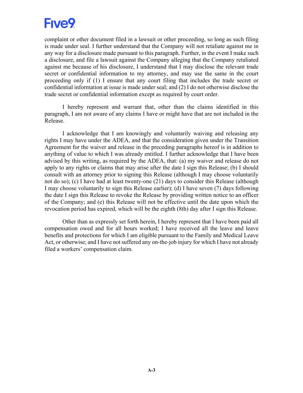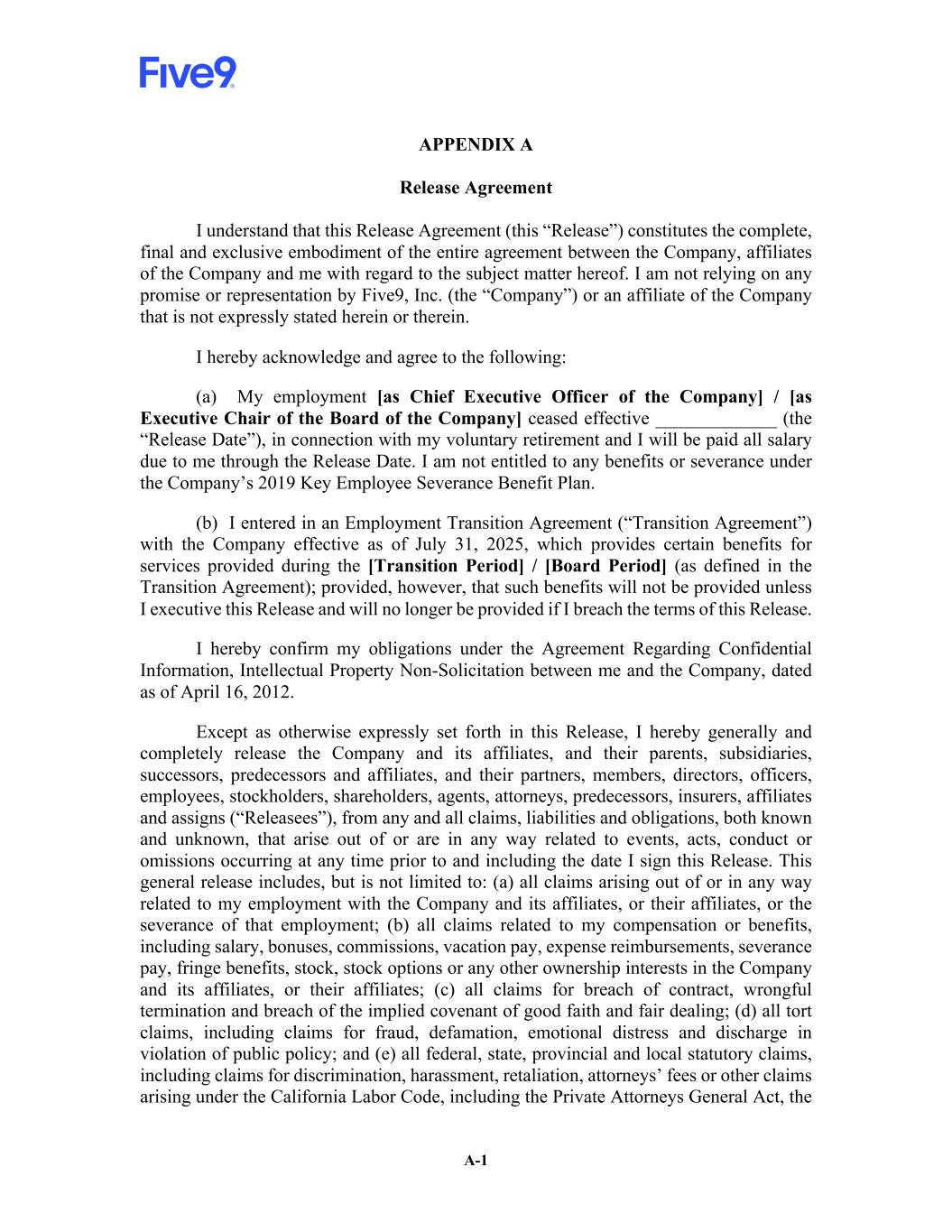 A-1 APPENDIX A Release Agreement I understand that this Release Agreement (this “Release”) constitutes the complete, final and exclusive embodiment of the entire agreement between the Company, affiliates of the Company and me with regard to the subject matter hereof. I am not relying on any promise or representation by Five9, Inc. (the “Company”) or an affiliate of the Company that is not expressly stated herein or therein. I hereby acknowledge and agree to the following: (a) My employment [as Chief Executive Officer of the Company] / [as Executive Chair of the Board of the Company] ceased effective _____________ (the “Release Date”), in connection with my voluntary retirement and I will be paid all salary due to me through the Release Date. I am not entitled to any benefits or severance under the Company’s 2019 Key Employee Severance Benefit Plan. (b) I entered in an Employment Transition Agreement (“Transition Agreement”) with the Company effective as of July 31, 2025, which provides certain benefits for services provided during the [Transition Period] / [Board Period] (as defined in the Transition Agreement); provided, however, that such benefits will not be provided unless I executive this Release and will no longer be provided if I breach the terms of this Release. I hereby confirm my obligations under the Agreement Regarding Confidential Information, Intellectual Property Non-Solicitation between me and the Company, dated as of April 16, 2012. Except as otherwise expressly set forth in this Release, I hereby generally and completely release the Company and its affiliates, and their parents, subsidiaries, successors, predecessors and affiliates, and their partners, members, directors, officers, employees, stockholders, shareholders, agents, attorneys, predecessors, insurers, affiliates and assigns (“Releasees”), from any and all claims, liabilities and obligations, both known and unknown, that arise out of or are in any way related to events, acts, conduct or omissions occurring at any time prior to and including the date I sign this Release. This general release includes, but is not limited to: (a) all claims arising out of or in any way related to my employment with the Company and its affiliates, or their affiliates, or the severance of that employment; (b) all claims related to my compensation or benefits, including salary, bonuses, commissions, vacation pay, expense reimbursements, severance pay, fringe benefits, stock, stock options or any other ownership interests in the Company and its affiliates, or their affiliates; (c) all claims for breach of contract, wrongful termination and breach of the implied covenant of good faith and fair dealing; (d) all tort claims, including claims for fraud, defamation, emotional distress and discharge in violation of public policy; and (e) all federal, state, provincial and local statutory claims, including claims for discrimination, harassment, retaliation, attorneys’ fees or other claims arising under the California Labor Code, including the Private Attorneys General Act, the