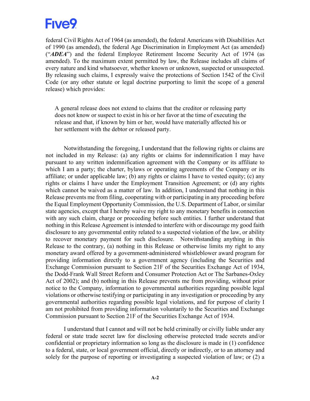 A-2 federal Civil Rights Act of 1964 (as amended), the federal Americans with Disabilities Act of 1990 (as amended), the federal Age Discrimination in Employment Act (as amended) (“ADEA”) and the federal Employee Retirement Income Security Act of 1974 (as amended). To the maximum extent permitted by law, the Release includes all claims of every nature and kind whatsoever, whether known or unknown, suspected or unsuspected. By releasing such claims, I expressly waive the protections of Section 1542 of the Civil Code (or any other statute or legal doctrine purporting to limit the scope of a general release) which provides: A general release does not extend to claims that the creditor or releasing party does not know or suspect to exist in his or her favor at the time of executing the release and that, if known by him or her, would have materially affected his or her settlement with the debtor or released party. Notwithstanding the foregoing, I understand that the following rights or claims are not included in my Release: (a) any rights or claims for indemnification I may have pursuant to any written indemnification agreement with the Company or its affiliate to which I am a party; the charter, bylaws or operating agreements of the Company or its affiliate; or under applicable law; (b) any rights or claims I have to vested equity; (c) any rights or claims I have under the Employment Transition Agreement; or (d) any rights which cannot be waived as a matter of law. In addition, I understand that nothing in this Release prevents me from filing, cooperating with or participating in any proceeding before the Equal Employment Opportunity Commission, the U.S. Department of Labor, or similar state agencies, except that I hereby waive my right to any monetary benefits in connection with any such claim, charge or proceeding before such entities. I further understand that nothing in this Release Agreement is intended to interfere with or discourage my good faith disclosure to any governmental entity related to a suspected violation of the law, or ability to recover monetary payment for such disclosure. Notwithstanding anything in this Release to the contrary, (a) nothing in this Release or otherwise limits my right to any monetary award offered by a government-administered whistleblower award program for providing information directly to a government agency (including the Securities and Exchange Commission pursuant to Section 21F of the Securities Exchange Act of 1934, the Dodd-Frank Wall Street Reform and Consumer Protection Act or The Sarbanes-Oxley Act of 2002); and (b) nothing in this Release prevents me from providing, without prior notice to the Company, information to governmental authorities regarding possible legal violations or otherwise testifying or participating in any investigation or proceeding by any governmental authorities regarding possible legal violations, and for purpose of clarity I am not prohibited from providing information voluntarily to the Securities and Exchange Commission pursuant to Section 21F of the Securities Exchange Act of 1934. I understand that I cannot and will not be held criminally or civilly liable under any federal or state trade secret law for disclosing otherwise protected trade secrets and/or confidential or proprietary information so long as the disclosure is made in (1) confidence to a federal, state, or local government official, directly or indirectly, or to an attorney and solely for the purpose of reporting or investigating a suspected violation of law; or (2) a