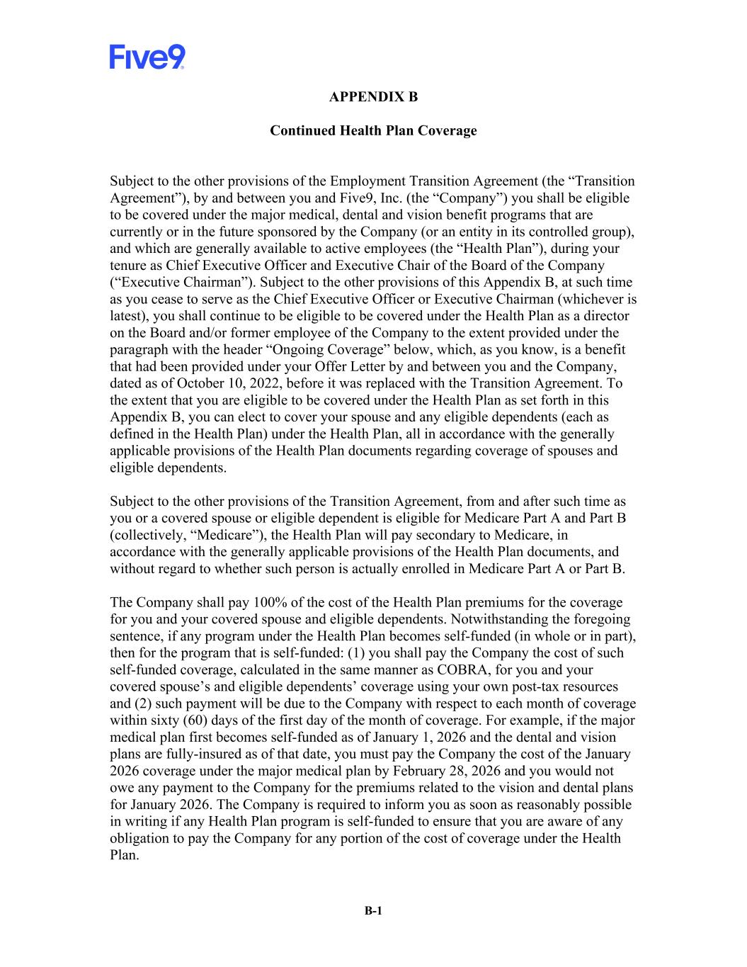 B-1 APPENDIX B Continued Health Plan Coverage Subject to the other provisions of the Employment Transition Agreement (the “Transition Agreement”), by and between you and Five9, Inc. (the “Company”) you shall be eligible to be covered under the major medical, dental and vision benefit programs that are currently or in the future sponsored by the Company (or an entity in its controlled group), and which are generally available to active employees (the “Health Plan”), during your tenure as Chief Executive Officer and Executive Chair of the Board of the Company (“Executive Chairman”). Subject to the other provisions of this Appendix B, at such time as you cease to serve as the Chief Executive Officer or Executive Chairman (whichever is latest), you shall continue to be eligible to be covered under the Health Plan as a director on the Board and/or former employee of the Company to the extent provided under the paragraph with the header “Ongoing Coverage” below, which, as you know, is a benefit that had been provided under your Offer Letter by and between you and the Company, dated as of October 10, 2022, before it was replaced with the Transition Agreement. To the extent that you are eligible to be covered under the Health Plan as set forth in this Appendix B, you can elect to cover your spouse and any eligible dependents (each as defined in the Health Plan) under the Health Plan, all in accordance with the generally applicable provisions of the Health Plan documents regarding coverage of spouses and eligible dependents. Subject to the other provisions of the Transition Agreement, from and after such time as you or a covered spouse or eligible dependent is eligible for Medicare Part A and Part B (collectively, “Medicare”), the Health Plan will pay secondary to Medicare, in accordance with the generally applicable provisions of the Health Plan documents, and without regard to whether such person is actually enrolled in Medicare Part A or Part B. The Company shall pay 100% of the cost of the Health Plan premiums for the coverage for you and your covered spouse and eligible dependents. Notwithstanding the foregoing sentence, if any program under the Health Plan becomes self-funded (in whole or in part), then for the program that is self-funded: (1) you shall pay the Company the cost of such self-funded coverage, calculated in the same manner as COBRA, for you and your covered spouse’s and eligible dependents’ coverage using your own post-tax resources and (2) such payment will be due to the Company with respect to each month of coverage within sixty (60) days of the first day of the month of coverage. For example, if the major medical plan first becomes self-funded as of January 1, 2026 and the dental and vision plans are fully-insured as of that date, you must pay the Company the cost of the January 2026 coverage under the major medical plan by February 28, 2026 and you would not owe any payment to the Company for the premiums related to the vision and dental plans for January 2026. The Company is required to inform you as soon as reasonably possible in writing if any Health Plan program is self-funded to ensure that you are aware of any obligation to pay the Company for any portion of the cost of coverage under the Health Plan.