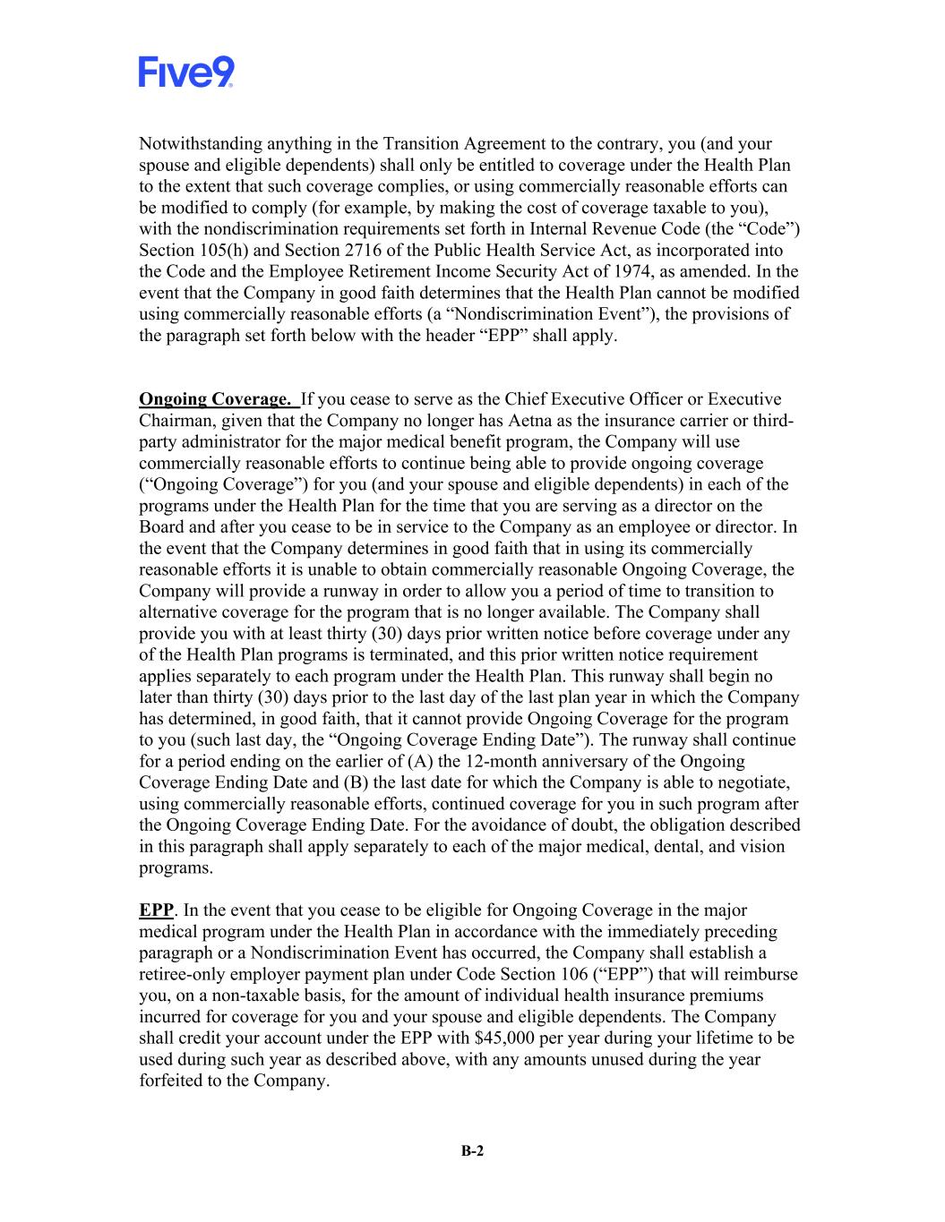 B-2 Notwithstanding anything in the Transition Agreement to the contrary, you (and your spouse and eligible dependents) shall only be entitled to coverage under the Health Plan to the extent that such coverage complies, or using commercially reasonable efforts can be modified to comply (for example, by making the cost of coverage taxable to you), with the nondiscrimination requirements set forth in Internal Revenue Code (the “Code”) Section 105(h) and Section 2716 of the Public Health Service Act, as incorporated into the Code and the Employee Retirement Income Security Act of 1974, as amended. In the event that the Company in good faith determines that the Health Plan cannot be modified using commercially reasonable efforts (a “Nondiscrimination Event”), the provisions of the paragraph set forth below with the header “EPP” shall apply. Ongoing Coverage. If you cease to serve as the Chief Executive Officer or Executive Chairman, given that the Company no longer has Aetna as the insurance carrier or third- party administrator for the major medical benefit program, the Company will use commercially reasonable efforts to continue being able to provide ongoing coverage (“Ongoing Coverage”) for you (and your spouse and eligible dependents) in each of the programs under the Health Plan for the time that you are serving as a director on the Board and after you cease to be in service to the Company as an employee or director. In the event that the Company determines in good faith that in using its commercially reasonable efforts it is unable to obtain commercially reasonable Ongoing Coverage, the Company will provide a runway in order to allow you a period of time to transition to alternative coverage for the program that is no longer available. The Company shall provide you with at least thirty (30) days prior written notice before coverage under any of the Health Plan programs is terminated, and this prior written notice requirement applies separately to each program under the Health Plan. This runway shall begin no later than thirty (30) days prior to the last day of the last plan year in which the Company has determined, in good faith, that it cannot provide Ongoing Coverage for the program to you (such last day, the “Ongoing Coverage Ending Date”). The runway shall continue for a period ending on the earlier of (A) the 12-month anniversary of the Ongoing Coverage Ending Date and (B) the last date for which the Company is able to negotiate, using commercially reasonable efforts, continued coverage for you in such program after the Ongoing Coverage Ending Date. For the avoidance of doubt, the obligation described in this paragraph shall apply separately to each of the major medical, dental, and vision programs. EPP. In the event that you cease to be eligible for Ongoing Coverage in the major medical program under the Health Plan in accordance with the immediately preceding paragraph or a Nondiscrimination Event has occurred, the Company shall establish a retiree-only employer payment plan under Code Section 106 (“EPP”) that will reimburse you, on a non-taxable basis, for the amount of individual health insurance premiums incurred for coverage for you and your spouse and eligible dependents. The Company shall credit your account under the EPP with $45,000 per year during your lifetime to be used during such year as described above, with any amounts unused during the year forfeited to the Company.