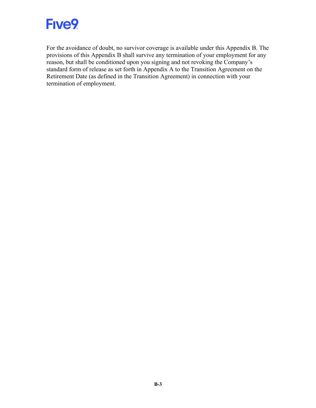 B-3 For the avoidance of doubt, no survivor coverage is available under this Appendix B. The provisions of this Appendix B shall survive any termination of your employment for any reason, but shall be conditioned upon you signing and not revoking the Company’s standard form of release as set forth in Appendix A to the Transition Agreement on the Retirement Date (as defined in the Transition Agreement) in connection with your termination of employment.